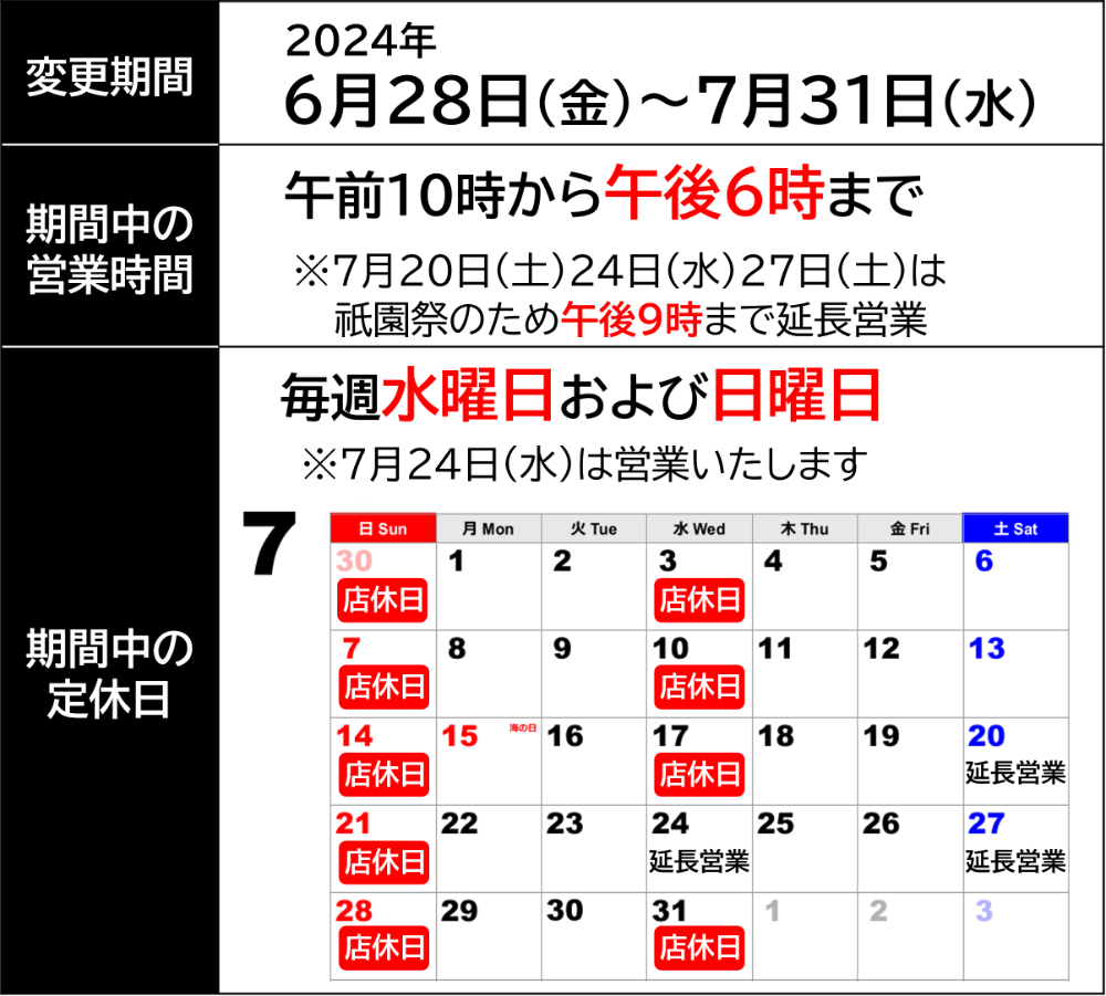 【店舗】期間限定 営業時間および定休日変更のお知らせ